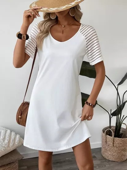 Yuvarlak Yaka Özel Kumaş Beyaz Kısa Elbise