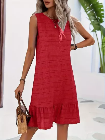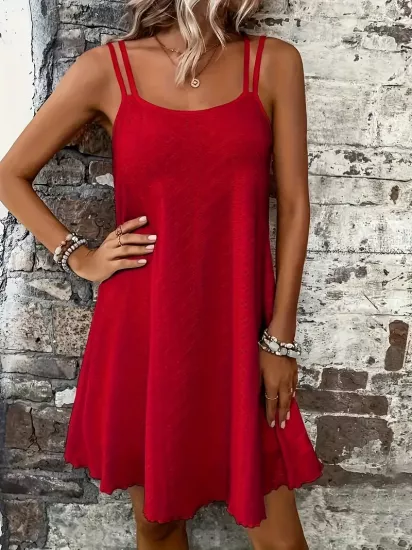 Dokuma Ayarlanabilir Askılı Kırmızı Kısa Elbise