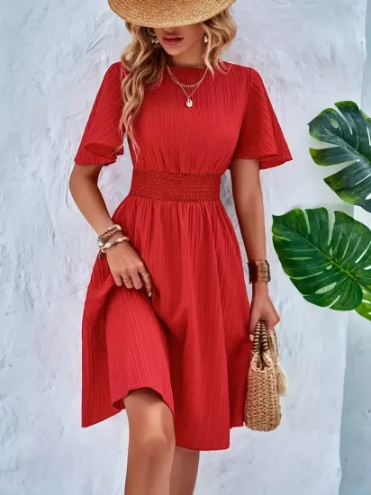 Yuvarlak Yaka Özel Kumaş Kırmızı Kısa Elbise