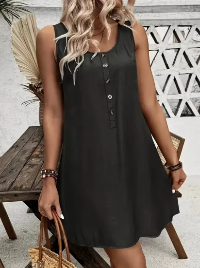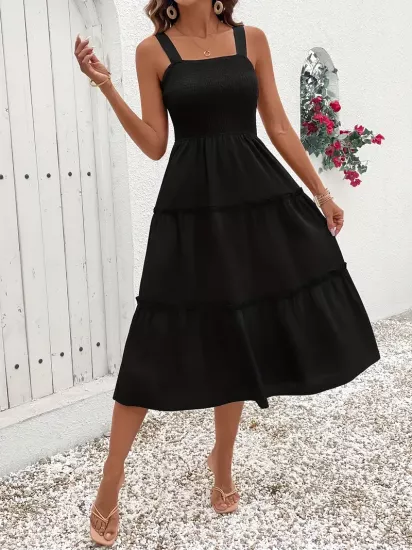 Dokuma Ayarlanabilir Askılı Siyah Kısa Elbise