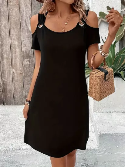 Yuvarlak Yaka Özel Kumaş Siyah Kısa Elbise