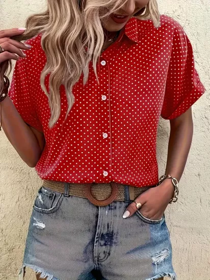 Kısa Kollu Nokta Desenli Kırmızı Kadın Gömlek