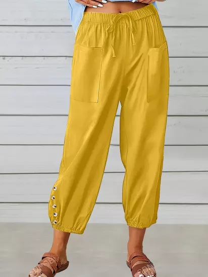 Yüksek Bel Esnek Kumaş Bol Kesim Sarı Kadın...